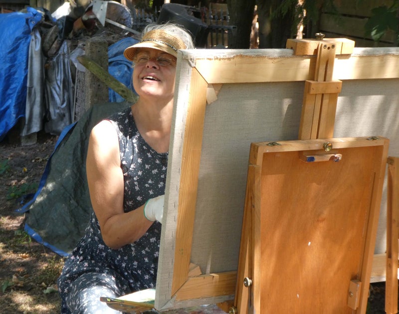 Terwijl ik in de tuin van nr 11 mocht schilderen, schilderde Marjolein in de tuin van nr 13. Het was warm. We zaten allebei in de schaduw en genoten van geweldige sfeer van die plekken. De gastvrijheid van de bewoners droeg daar nog extra aan bij. Een week later was voor mij nr 13 ook aan de beurt, maar Marjolein had daar zo'n plezier dat zij nog een schilderij van dat adres maakte, terwijl ik vlak bij haar zat en een vanuit een ander standpunt schilderde.